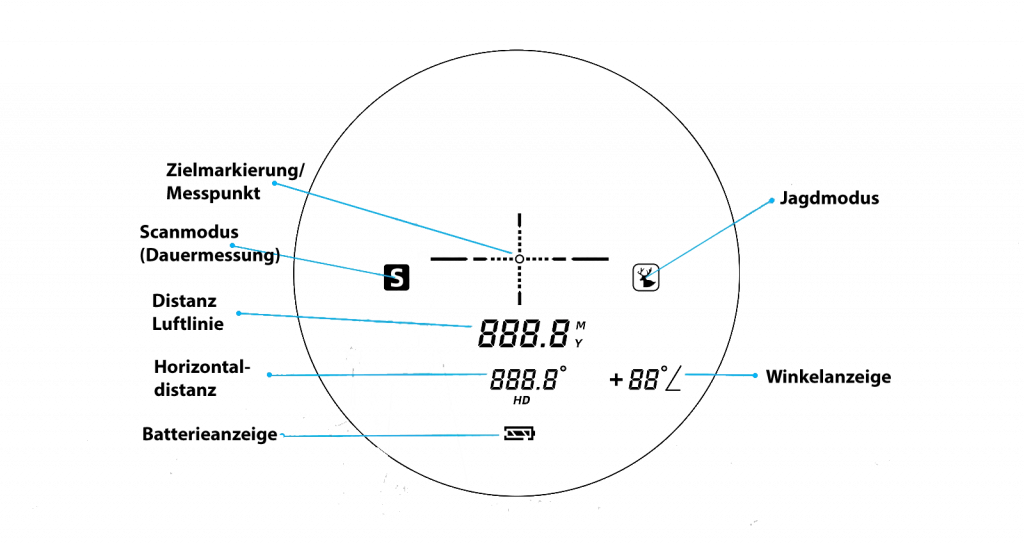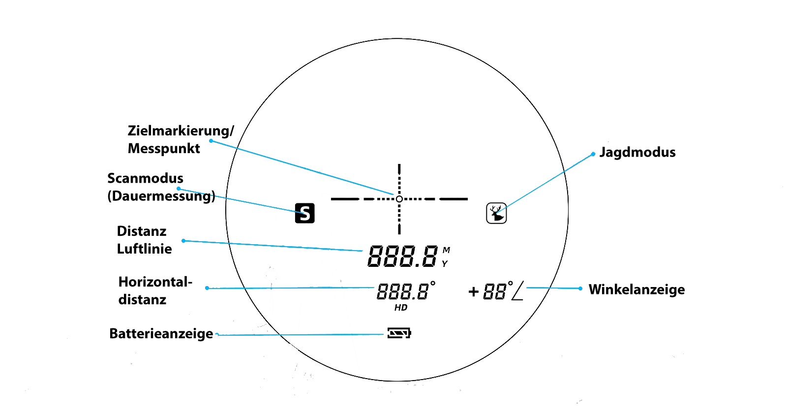 3 Messmethoden: Standard, HD/Jagdmodus mit Anzeige der Horizontaldistanz (winkelkompensiert) und Scanmodus (permanente Messung)